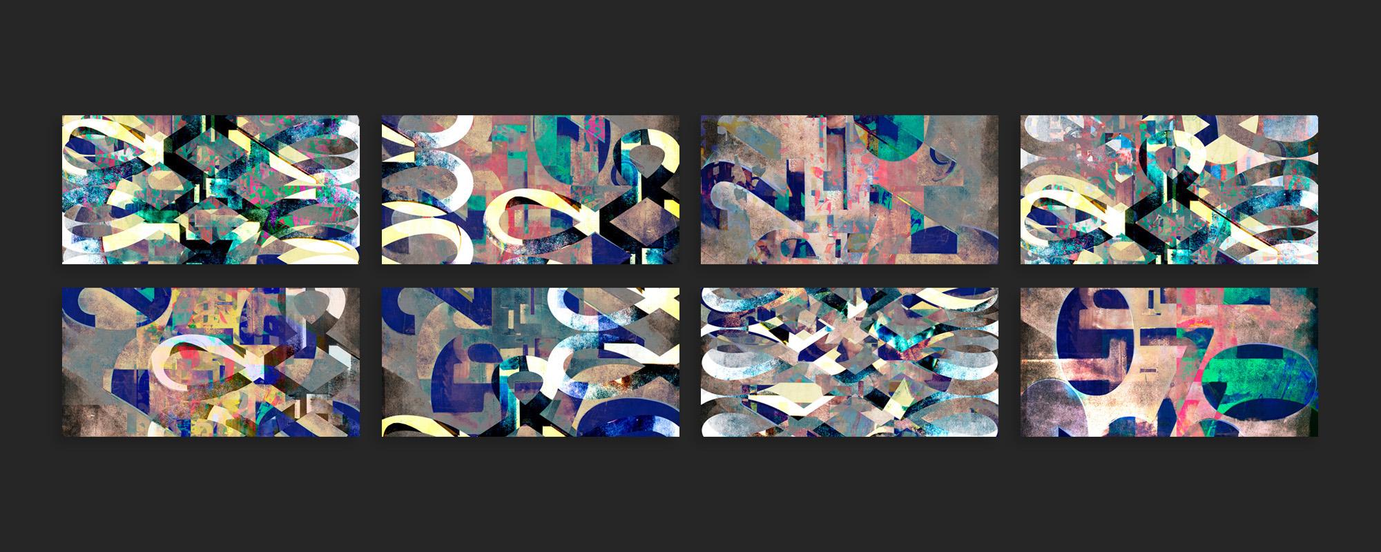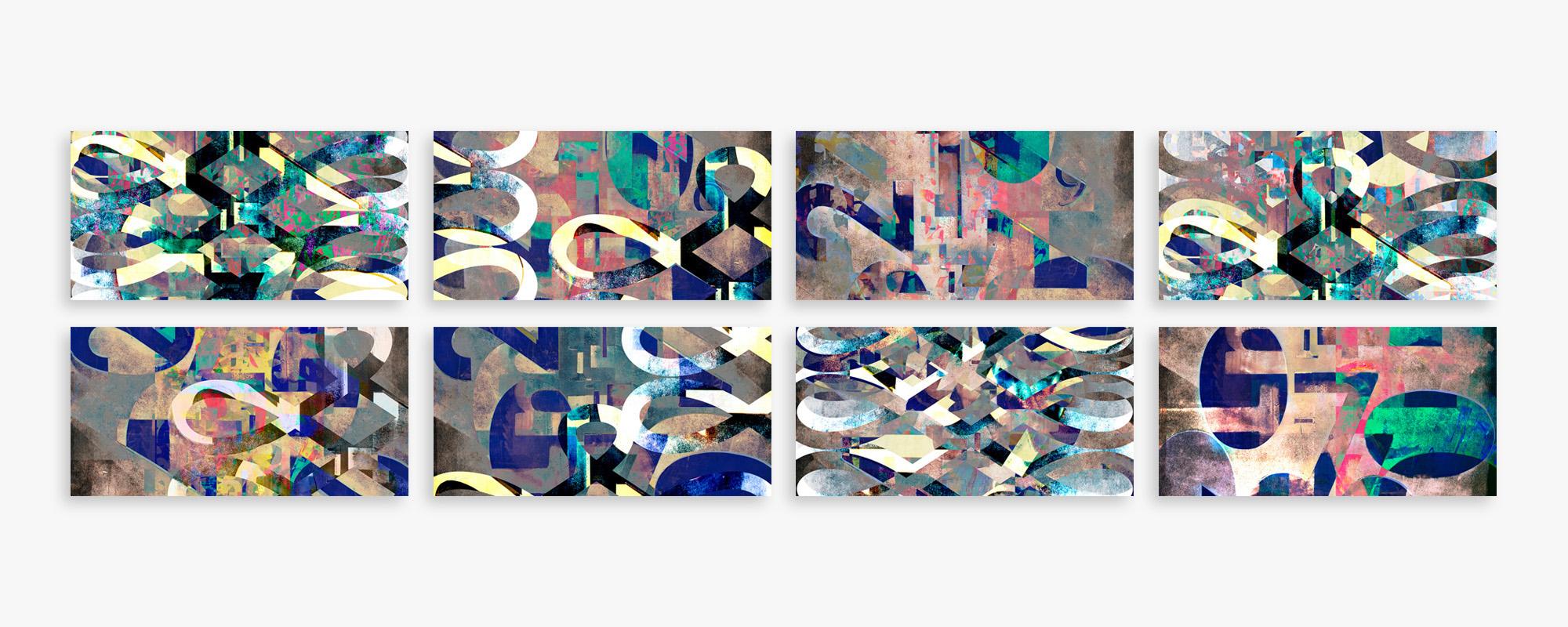 The graphic series (Lindlip, Lipsum, Folyoda) based on each other are characterized by coloured surfaces, stylized shapes, transparent layers, letters and numbers, sometimes hidden characters and motifs.
